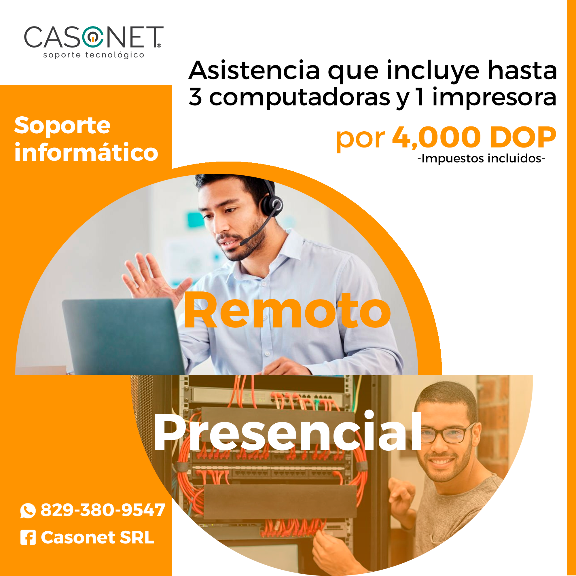 Servicio completo desde 4,000 DOP al mes, incluye asistencia remota y hasta 5 visitas técnicas mensuales para 3 computadoras y 1 impresora.